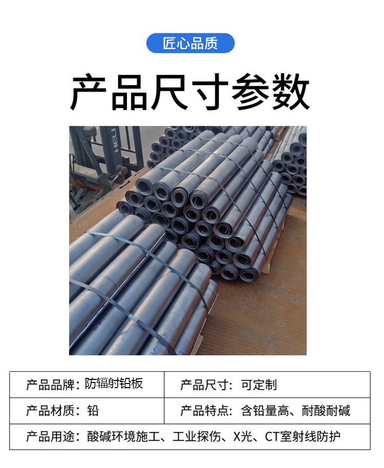 铅在许多工业领域中得到应用,铅丝和铅条广泛用于制酸工业、蓄电池、电缆包皮及冶金工业设备中起防腐蚀效果;铅板能吸收放射性射线,可作原子能工业、核辐射及x、r射线仪器设备和 医疗辐射防护材料;铅板可作机器设备隔音处理效果等。铅还能与锑、锡、铋等配 制成各种合金;用于各领域。