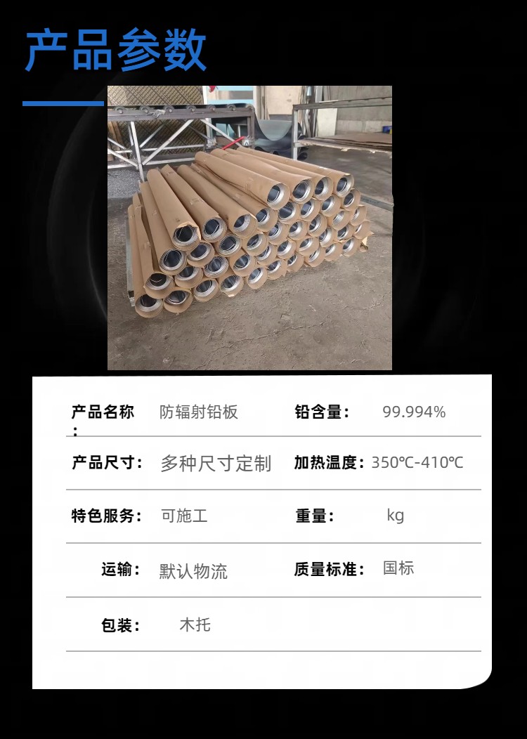 铅板,又名:铅皮,防辐射板材,含铅量高,防辐射效果好,铅板规格宽度50-1550mm,厚度从0.5-200mm,一般国内生产的铅板纯度为99.994%,密度为11.34g/cm。铅板生产严格执行标准,产品必须通过了射线防护卫生部器材防护质量监测中心得检测才能投入使用。